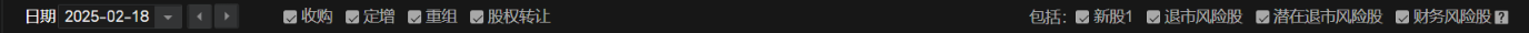 本功能提供常用关键字“收购”“定增”“重组”“股权转让”的股票池勾选,可以任意组合多选,查看该日期股票的出击情况。同时支持 包括新股1、退市风险股、潜在退市风险股、财务风险股的筛选。