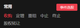 该区域最上方位置设置六个常用关键字选项: 收购、定增、重组、中止、终止、股权转让,点击相应关键字,右侧的股票池和相关公告资讯栏即可跳转至筛选结果。"常用"部分筛选结果范围为公告。“常用”部分右上方按钮为常用关键字“事件选股”界面的入口。