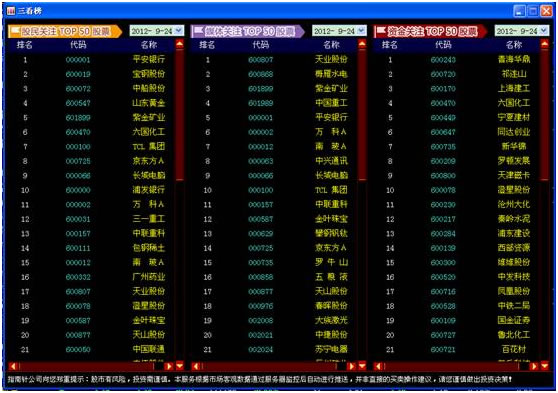 三看榜包括:用户关注榜、媒体关注榜、资金关注榜。 用户关注榜是股民在各大财经媒体、各大搜索网站上搜索次数排名前50只股票。 媒体关注榜是各大财经媒体,财经网站上关于个股资讯的播报频繁的前50只股票。 资金关注榜是多空资金进入多的前50只股票。 三看榜的界面如下图所示