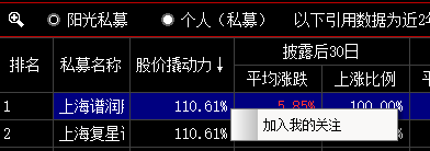 所有股东均可以加入我的关注,包括非私募类普通股东。操作方法1,私募英雄榜中选中任一私募,点击鼠标右键-加入我的关注