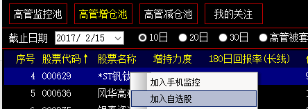 高管交易榜中任一股票池中股票,选中点击鼠标右键“加入自选股”同时进入我的关注中。需要说明的是,高管交易榜中我的关注以自选股为监控范围,股票需要加入自选股才能出现在我的关注中。