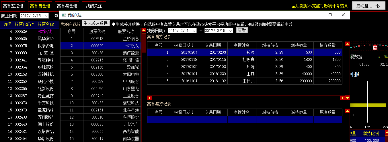 点击界面左上角“生成关注数据”按钮,自选股中有高管交易时可以在动态擒龙平台等功能中查看,有新数据时需要重新生成。