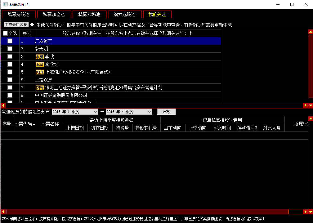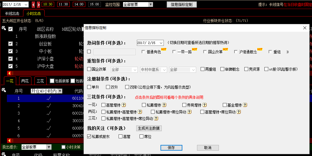 在信息指标定制中增加了“我的关注”,有新数据时需要先点击“生成关注数据”按钮,等数据生成后再勾选我的关注类别,点击保存按钮。私募或股东数据为来自私募英雄榜的关注股东,高管数据为来自高管交易榜的关注股票,席位数据为来自席位龙虎榜的关注席位。