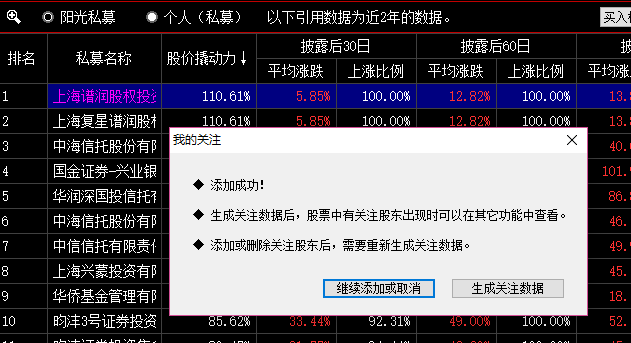 点击“加入我的关注”,当前选中的股东将被加入到我的关注中,同时弹出提示窗口,窗口中有“继续添加或取消”和“生成关注数据”两个按钮。点击“生成关注数据”按钮,将加入到我的关注中的股东生成数据,当股票中有关注股东出现的时候可以在其他功能中查看。点击“继续添加或取消”按钮关闭当前提示窗口,继续下一步。加入我的关注中的股东,字体颜色变为粉紫色,便于识别。