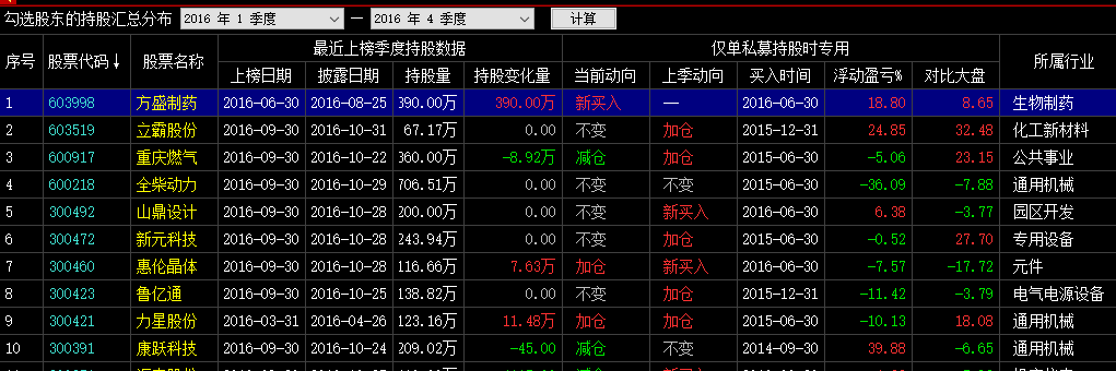 持股汇总分布。选中股东在指定报告期的持股汇总,展示了股东所持股票的代码名称、最近上榜季度的上榜日期、披露日期、持股量、持股变化量,私募性质的股东还展示了私募持股的当前动向、上季动向、买入时间、浮动盈亏、对比大盘以及股票所属行业。