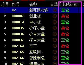 4、指数全景监控界面增加长线决策一列,提示五大战区八路纵队及0Z指数的开减仓情况,分为开仓、持仓、减仓、空仓四个状态。