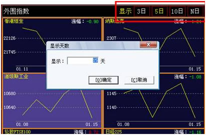 在选择“3日、5日、10日、N日”的选项时,显示的外围指数图是3日、5日、10日、N日周期的连续折线,这里需要说明的是,因为外盘交易时间和国内的不同,所以外围指数的日期会和A股日期有所差别。折线图周期是以左侧K线界面显示的最新日期为基准点计算的,假设左侧K线图上的最新日期是9月30日,那么3日外围指数曲线图就是9月30日向前计算3个交易日的折线。点击任意一个热线图,会在左侧K线指标窗中显示该指数的折线图。