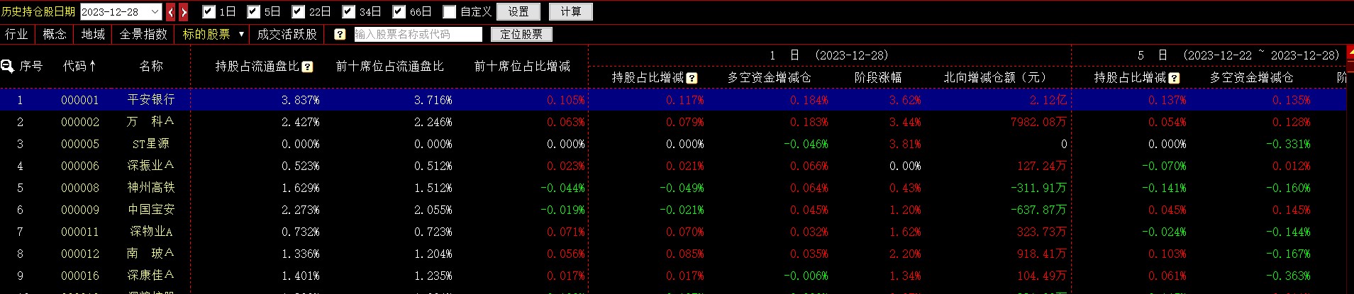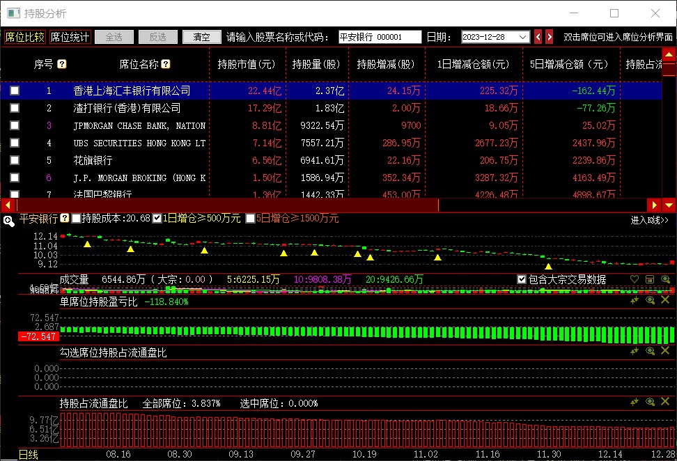 【席位持股列表】展示选中的席位所持有股票及相关指标,双击该股票所在行可进入【持股分析】界面。