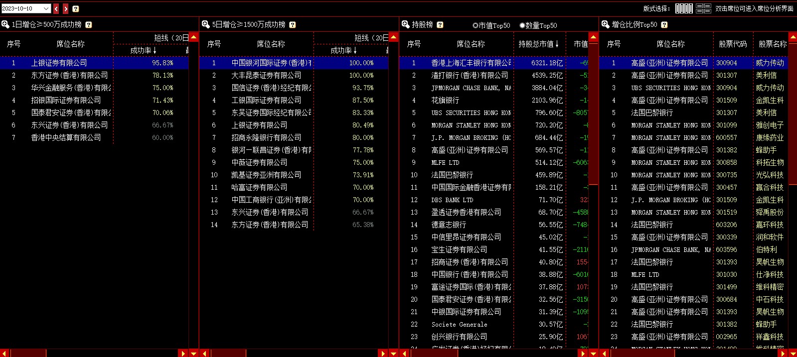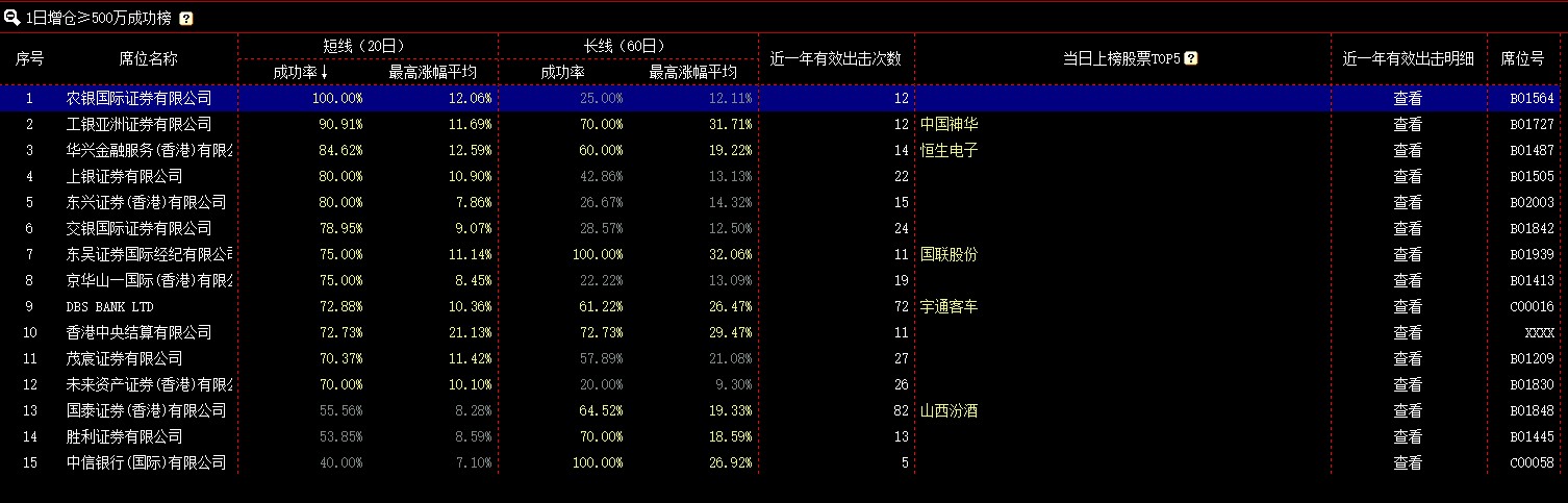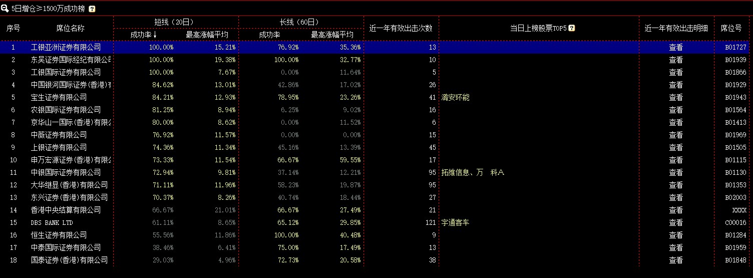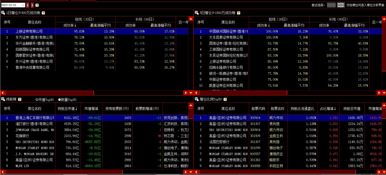 该模块展示每个交易日按一定规则统计的席位排行榜,共有4个榜单,分别是:1日增仓成功榜、5日增仓成功榜、持股榜(分持股市值前50和持股数量前50)、增仓比例榜。