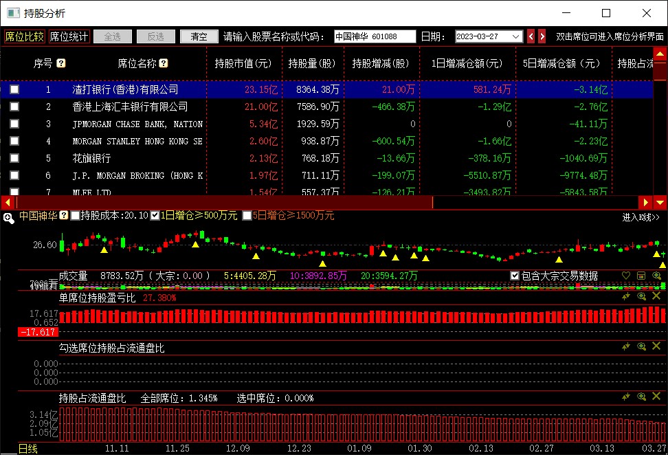 单击当日上榜股票TOP5中的股票,如单击中国神华,见图16,可直接跳转到该股票的持股分析界面,见图17