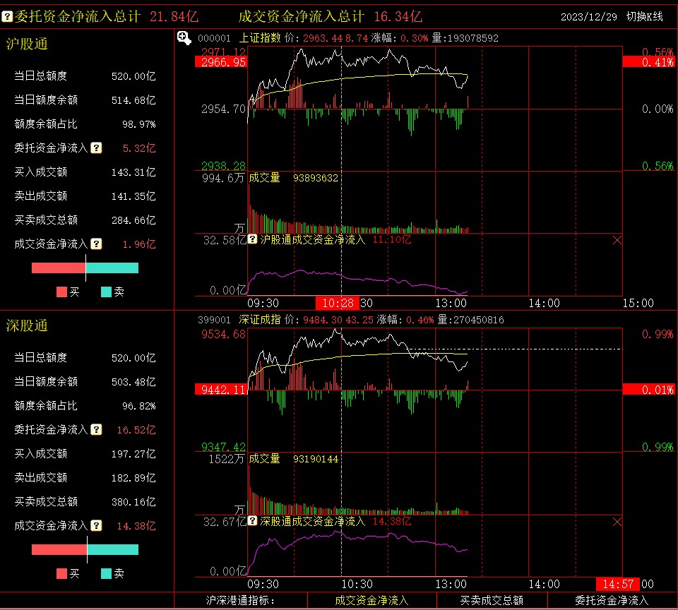 综合屏主要分左、右两个半屏,左半屏展示的是当日交易的即时行情数据,包括北向资金的额度使用、成交数据、资金流向等,见图2