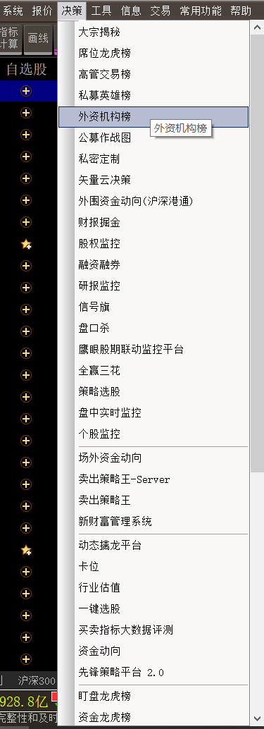 一、功能的调用:通过“决策”菜单---“外资机构榜”调用该功能(如下图所示)。