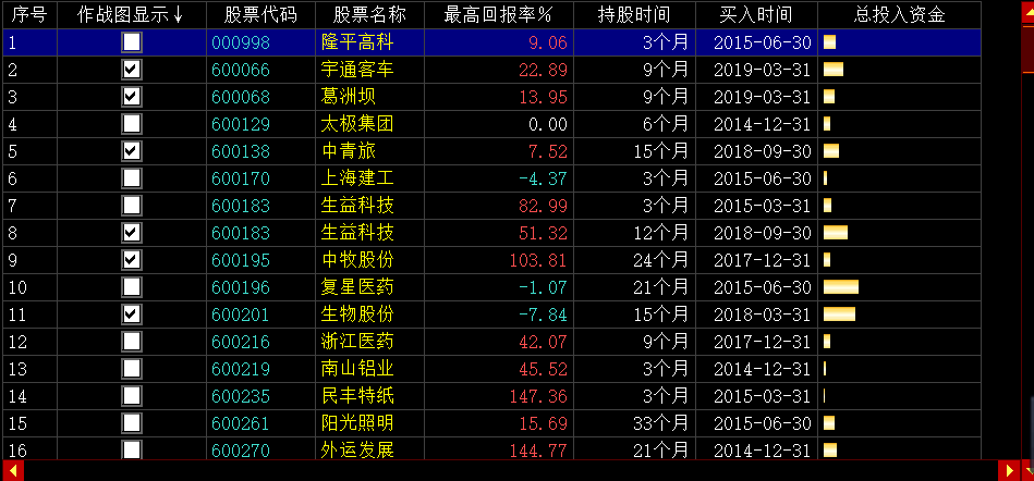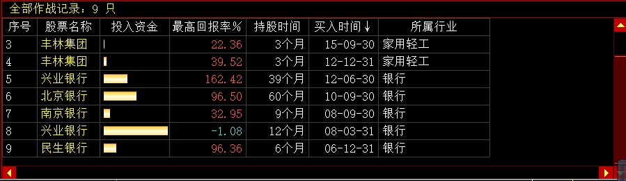 作战记录中显示的为所选期间,外资机构操作的股票,可以在此处选择在走势图上突出显示的股票,