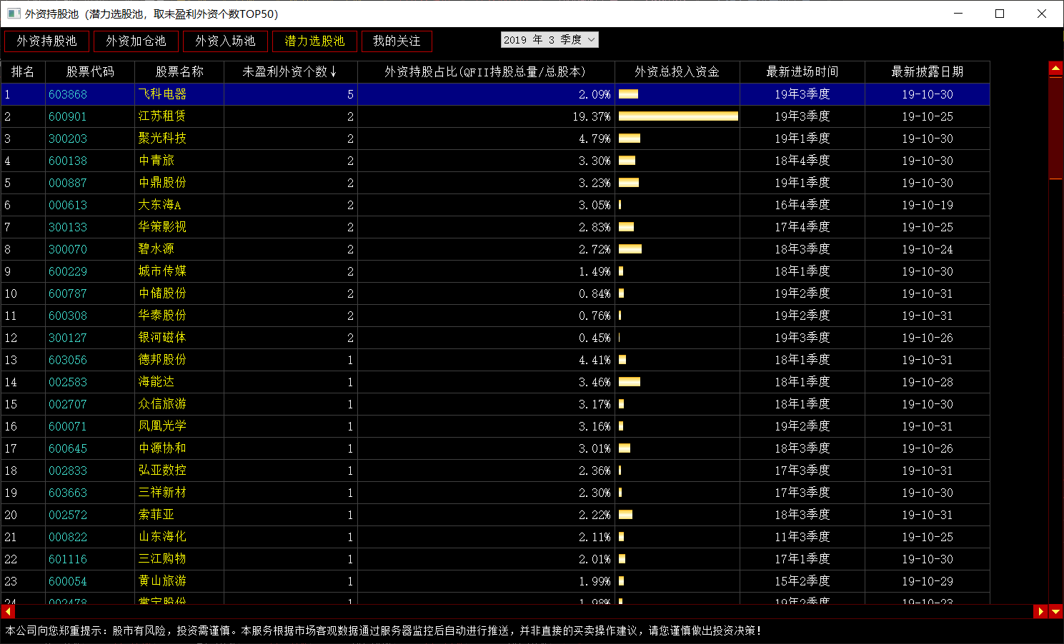 (4)潜力选股池:外资潜伏着的股票池,界面显示:排名、股票代码、股票名称、未盈利外资个数、外资持股占比、外资总投入资金、最新进场时间、最新披露日期。