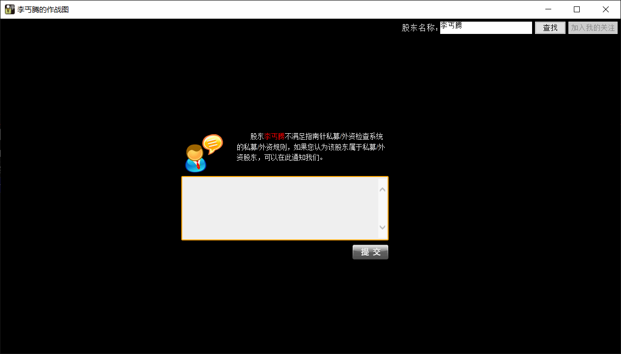 如果该自然人前面没有外资机构的图标,而用户认为该自然人是外资机构,可以双击该自然人,进入提交界面。给我们发邮件陈述认为该人是外资机构的理由。我们会参考用户的建议对外资机构进行更新。