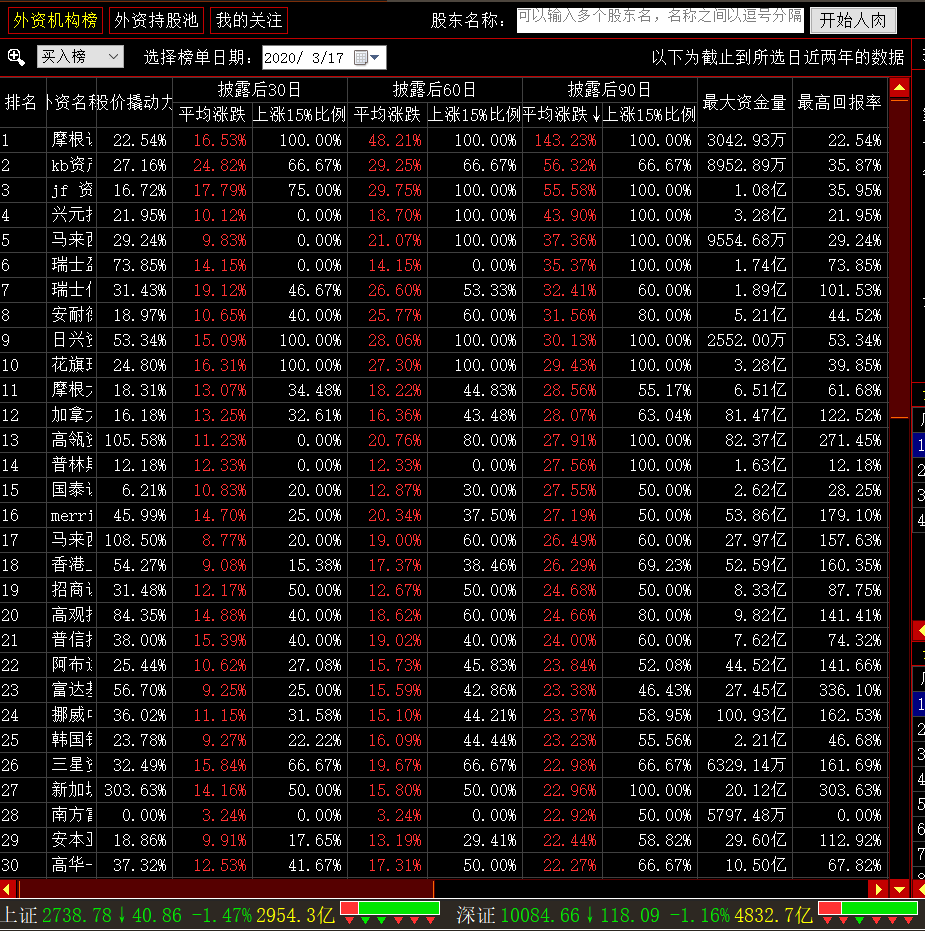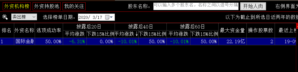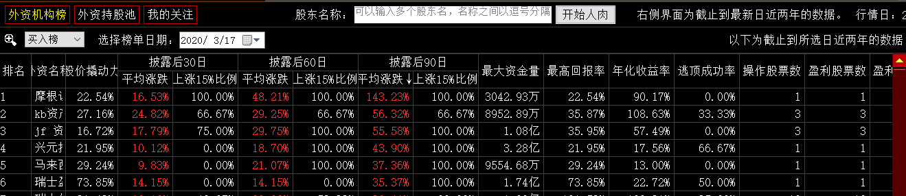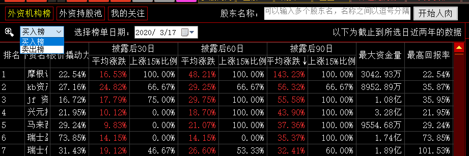 ,就调出了外资机构榜的功能界面。