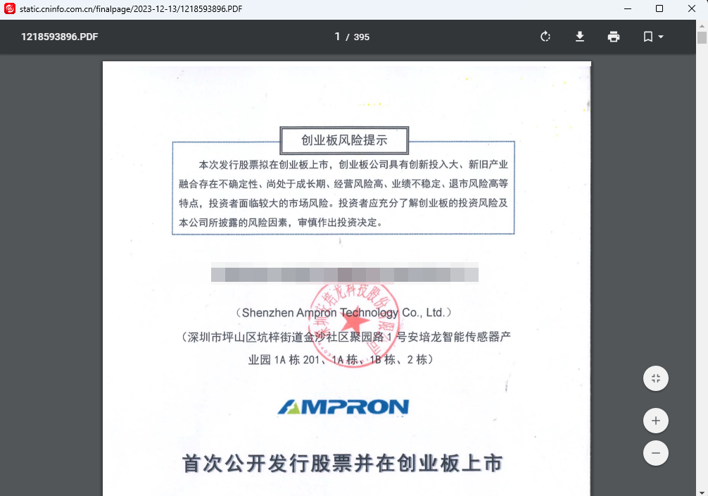 点击标题部分“查看招股说明书”可弹出该股票的招股说明书PDF。