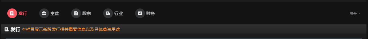 股票详细信息页面包括五个子栏目:发行,主营、股东、行业、财务。