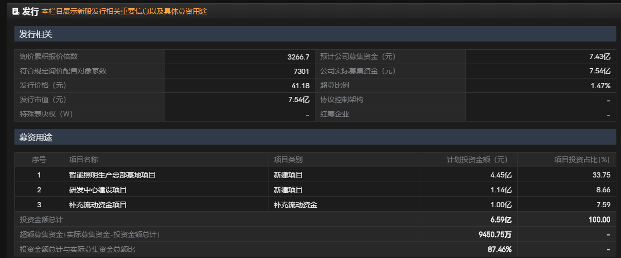“发行”展示该股票发行相关信息和本次募集用途详细情况。