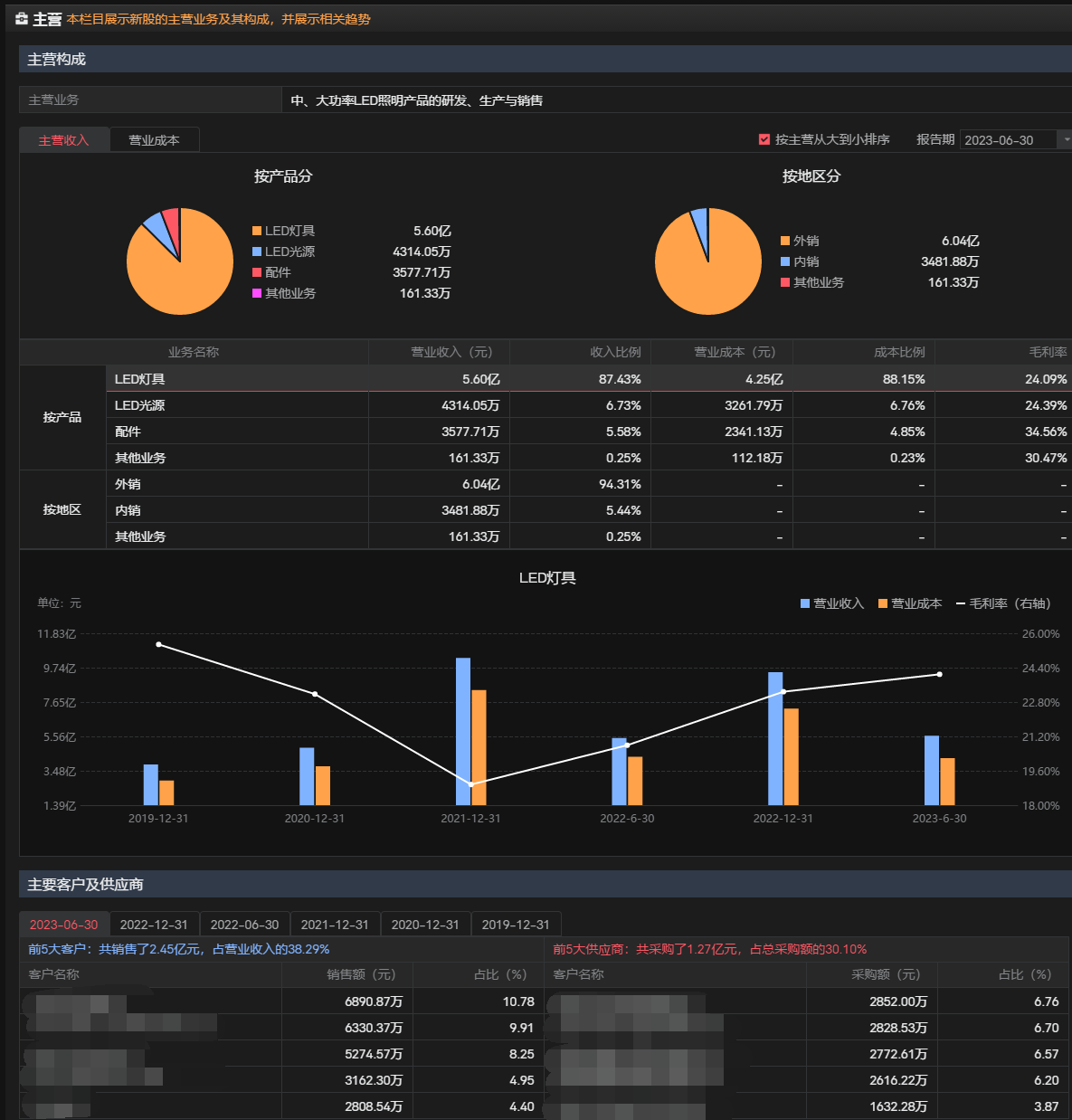 “主营”展示新股各报告期主营业务相关信息,并用趋势图展示近几年主营业务各分项的收支变动情况。
