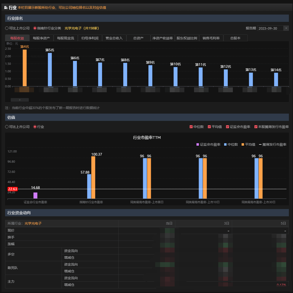 “行业”展示新股与所属行业其他股票、其他可比上市公司的各维度数据对比,并展示当前所属行业的最新资金动向。