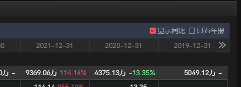 其中,勾选右上角的“显示同比”,主要财务指标的数据右侧将会出现本报告期数据相对于上年同期的同比变化数值。