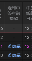 点击“定制中签查询提醒”列中,还未公布中签信息的新股的“编辑”按钮,可定制中签提醒