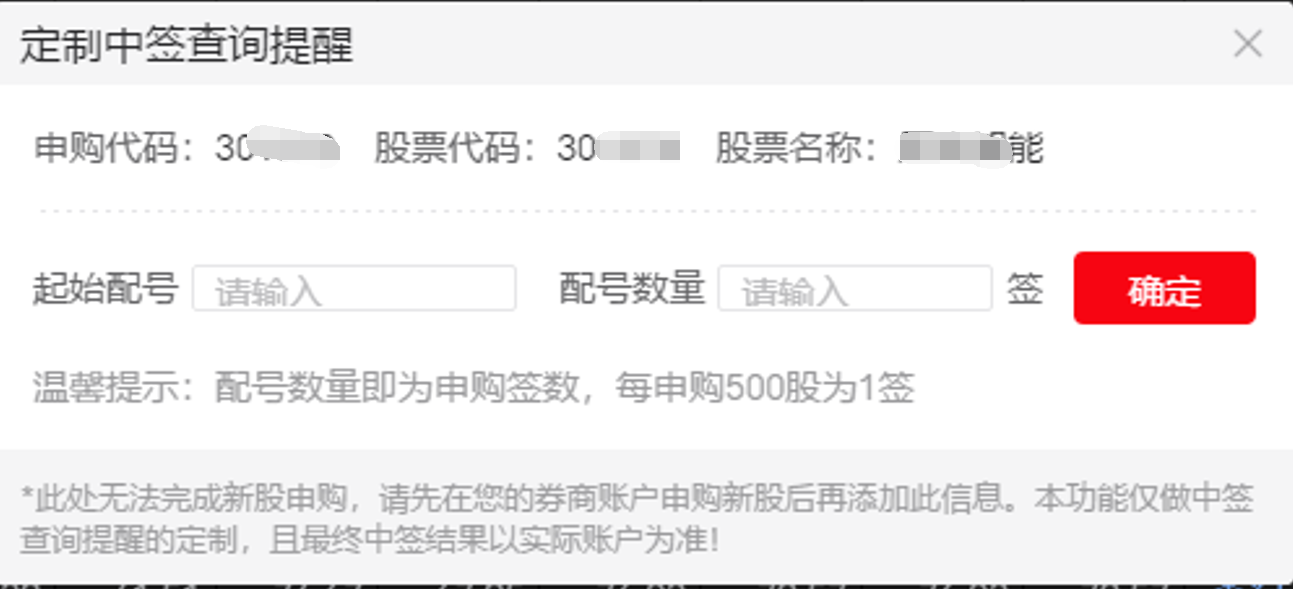 用户可在此处提前填入自己的起始配号和配号数量,到该新股中签公布日的时候,系统会自动弹小框提示。