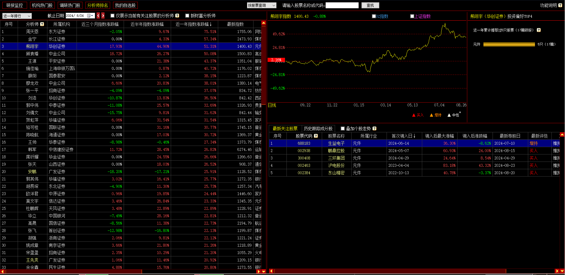 右侧为分析师指数的走势图、投资偏好T0P4、最新关注股票以及历史跟踪成分股。