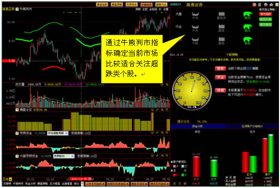 使用牛熊判市功能,判定当前的市场环境及适合关注的股票。在牛市的环境中适合关注追涨股、强势回调股,在震荡市的环境中适合关注高抛低吸、震荡回调的股票;在熊市的环境中合适关注超跌股。