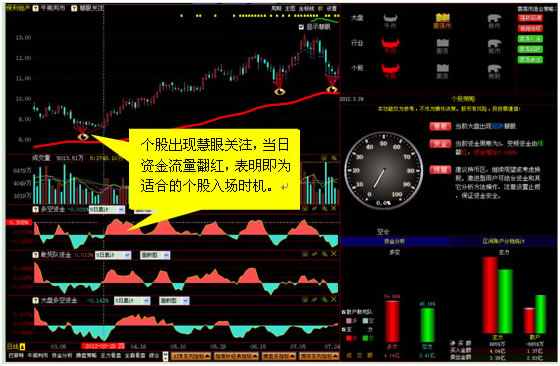 确定当前的时候环境之后,就要选定适合的入场时机,当出现慧眼关注提示及五日资金翻红即为适合的入场时机。