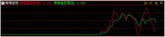 舆情监控指标反映的是舆论(股民、媒体等)对于股票的关注程度,红线为舆情关注快线,绿线为舆情关注慢线,舆情指数数值越大,说明舆论对本股票的关注程度越高。舆情监控界面如下图所示