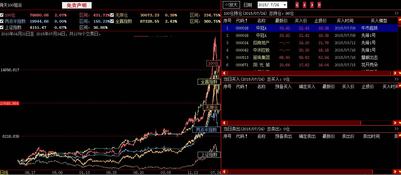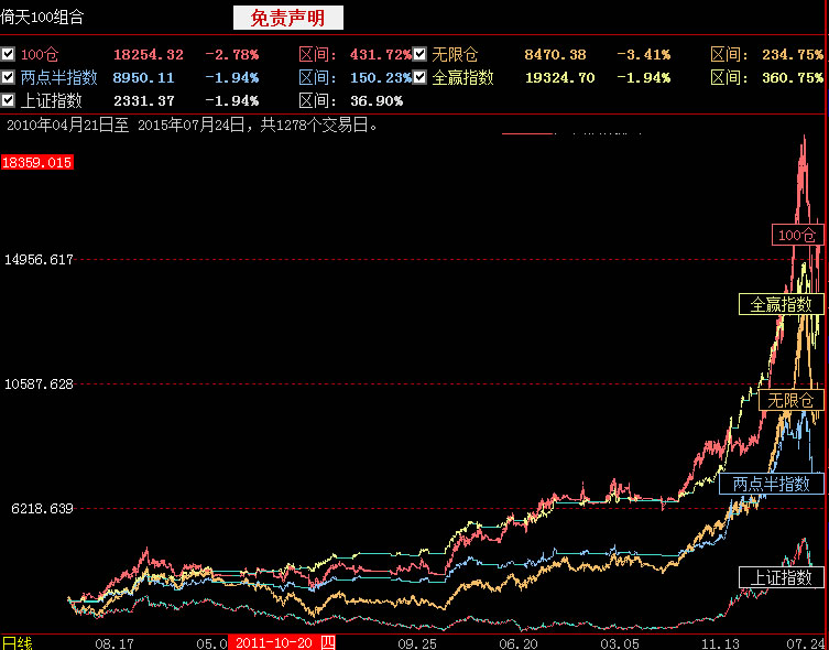 k线包括100仓指数、全赢指数、无限仓指数、两点半指数、上证指数。100仓指数是由100仓组合的股票计算得出,无限仓指数是指在不限制仓位的情况下的股票指数,两点半指数是根据全赢指数算出的真实的仓位指数。五个指数叠加进行对比。