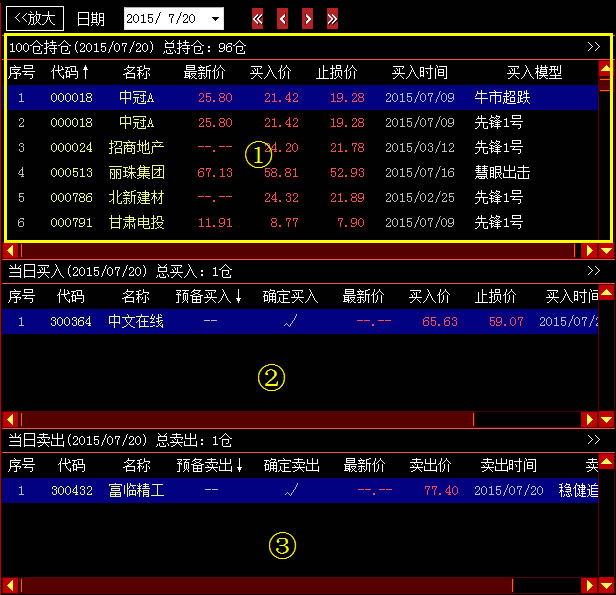 此组合中股票为当日预备买入和确定买入的股票。当股票发出买入信号时即显示预备买入状态,买入一仓位显示一条买入信息,买入多仓位显示相应数量的买入信息,当股票最终确认买入指令时即显示确定买入状态,同时该仓位的股票进入100仓持即①中。