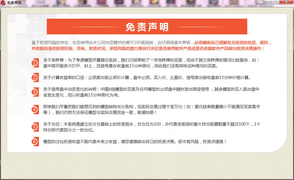 3. 本系统是建立在分仓基础上的投资组合,总仓位为100,亦代表该系统的最大持仓股票数量不超过100个,1个持仓即代表百分之一的仓位。当持仓组合满仓时,且个别股票的持仓仓位大于1时,持仓的股票类别亦会相应减少,多仓位股票则会显示多条买入信息。
