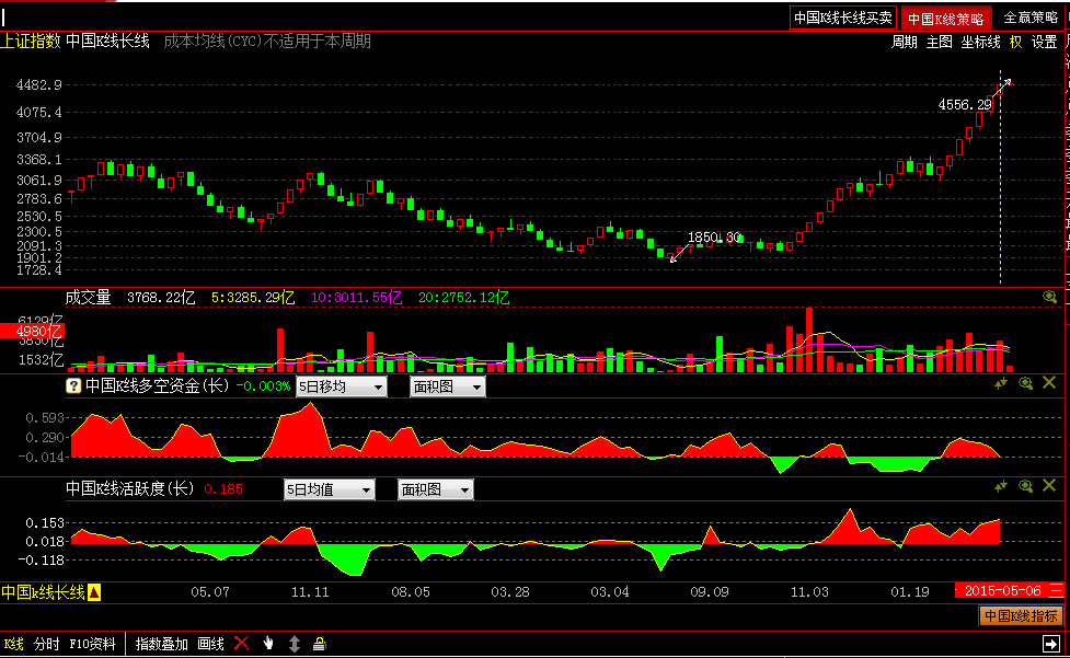 在中国k线长线的指示窗可选择“中国k线活跃度(长)”和“中国k线多空资金(长)”两个指标。