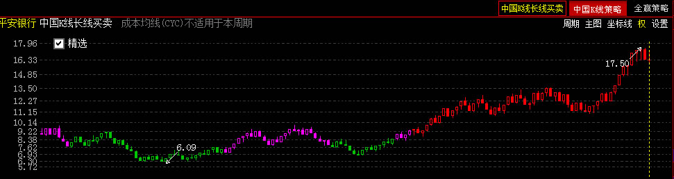 功能,勾选精选,中国k线长线买卖会出现三种颜色的k线图,粉色和绿色k线分别表示适宜和不适宜操作,红色k线即精选,是通过优化买卖点的方式提高了投资的平均收益率和整体成功率。