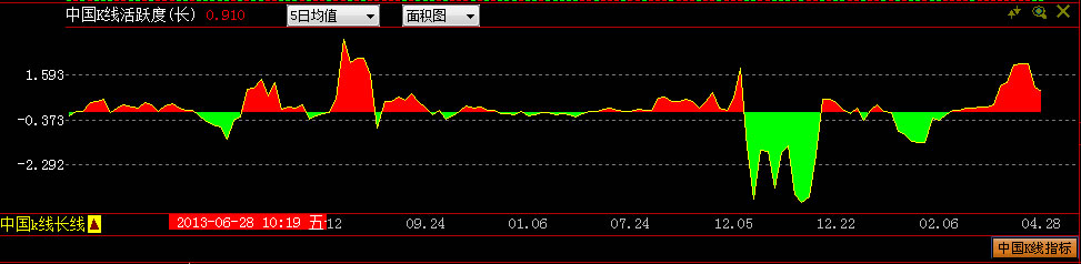 中国k线活跃度(长)指标,该指标代表了中国K线的活跃程度,指标的绝对值越大,说明股票近期涨跌越活跃,即形成1根中国K线的时间越短;相反,指标的绝对值越小,说明股票近期涨跌不活跃,即形成1根中国K线的时间越长。可选择1日、5日、10日、15日等不同时间统计周期的移动平均进行比较查看。