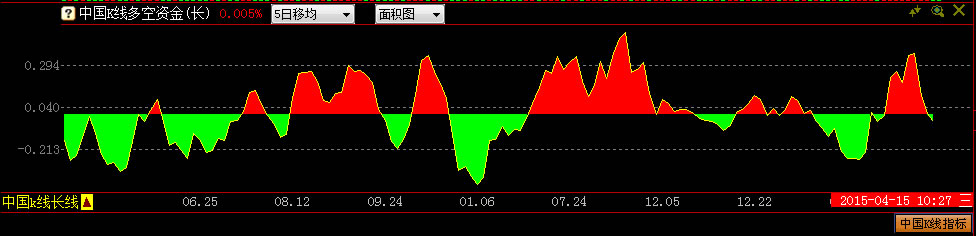中国k线多空资金(长)指标,分别显示1日资金、5日移动均值、10日移动均值、15日移动均值等不同时间周期的多空资金,反映资多空资金的买卖方向。