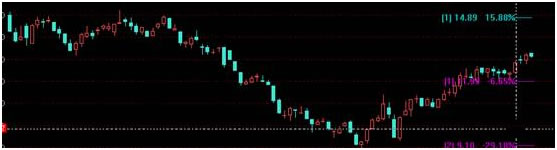 显示的内容:绿色线代表现价之上的阻力位,依次表示从低到高的阻力位。粉色线代表现价之下的支撑位,依次表示从高到低的支撑位。比如:绿色的‘ 14.89 15.88%’ 表示现价之下的阻力位是14.89元,当前价上涨15.88%即碰到阻力线.