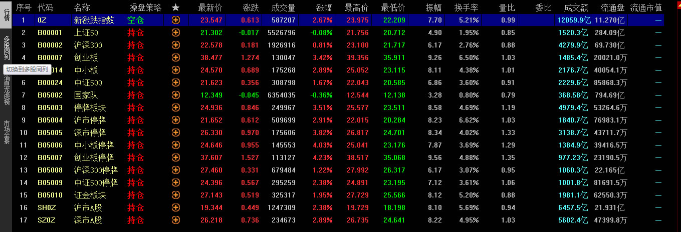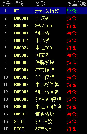 特殊类指数行情监控,除具有最新价、涨跌、成交量、涨幅、最高价、最低价、振幅、换手率、量比、成交额、流通盘等,还特有新增“操盘策略”指标监控,可以盘中实时监控以上指数的开仓、持仓、清仓、空仓状态及变化情况。