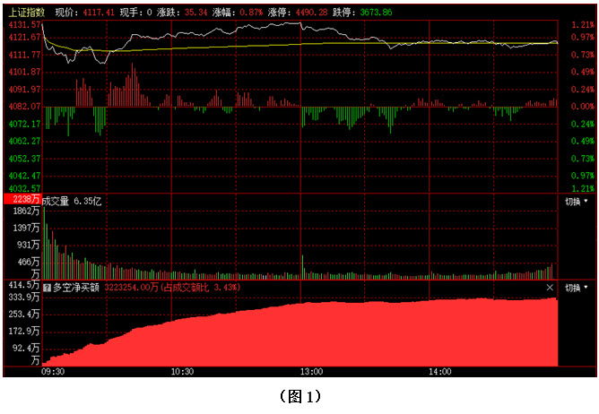 如图1所示,今日早间大盘大幅高开近50个点,随后指数虽有回探,但市场很快就在4100点整数关口附近获得支撑,并于10点后逐步上扬,盘中一度摸至4130点上方,可惜午后多方未能持续上攻,大盘再度回探,最终以4117点收盘。从下方的多空资金来看,早间开盘后,多方就占据优势,随后资金持续流入,即便是在午后大盘向下回探过程中,资金也没有出现明显的流出迹象。可见今日场外资金积极进场加仓,多方力量明显强于空方,说明节前选择离场避险的资金正在快速回流。在这种情况下,行情就具备了继续向上拉升的动能,所以接下来只要多方后续力量能够不断跟上,市场就有望进一步向上攀升。建议大家紧跟资金步伐,积极优选个股,择机介入。