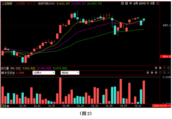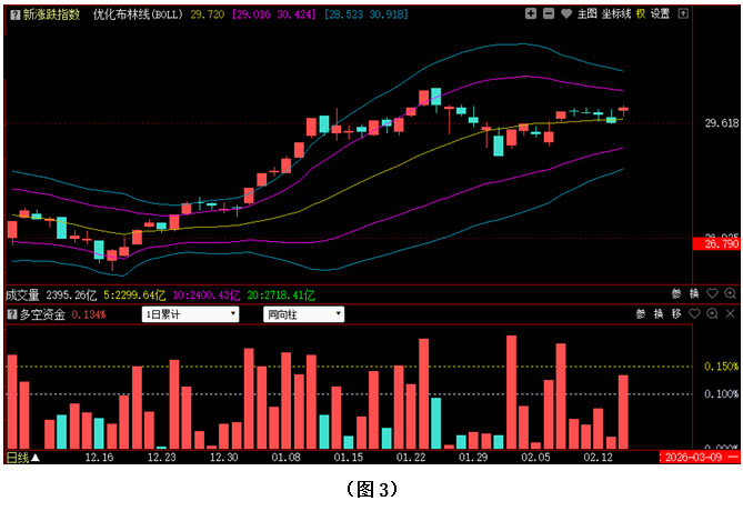 今日两市上涨个股共3764只,其中涨幅超过3%的个股1038只,涨幅在9.9%以上的个股119只;下跌个股共1344只,其中跌幅超过3%的个股292只,跌幅在9.9%以上的个股35只。图3所示为指南针特有的0Z指数K线图,从图中可以看到,今日0Z指数同样高开,并继续上攻,不仅最终以阳线报收,收盘位置重新回到优化布林中轨上方,而且还将前面四个交易日的失地全部收复。可见今日场内多数个股都出现了上涨,市场整体走势重新转强。从而为马年行情开了一个好头。从下方的多空资金来看,今日多空资金为流入状态,资金流入量较前几个交易日明显提高,说明节后首日资金进场十分坚决。在这种情况下,市场短期主动权就会继续掌握在多方手中,后市有望在资金的推动下继续震荡上行。