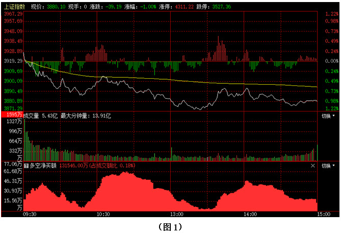如图1所示,今日早间开盘后,大盘就出现一波持续下探,3900点整数关口再度失守,盘中多方虽试图反击,但由于力度较弱,指数刚刚反弹至3900点附近就再度遇阻,市场只得继续向下寻求支撑,午后大盘虽没有大幅杀跌,但也没有出现强劲反弹,指数围绕着3880点窄幅震荡整理,最终以3880点收盘。从下方的多空资金来看,早间开盘后,多方就占据优势,盘中也曾几度发力,可惜资金进场的持续性较差,始终无法推动大盘向上形成强劲反弹。可见今日多方有护盘的意识,无奈场内做多人气较低,导致后续力量难以跟上。在这种情况下,一旦空方连续施压,恐慌性抛盘就会不断涌出,从而导致行情进一步向下回落。建议大家控制好仓位,保持谨慎。