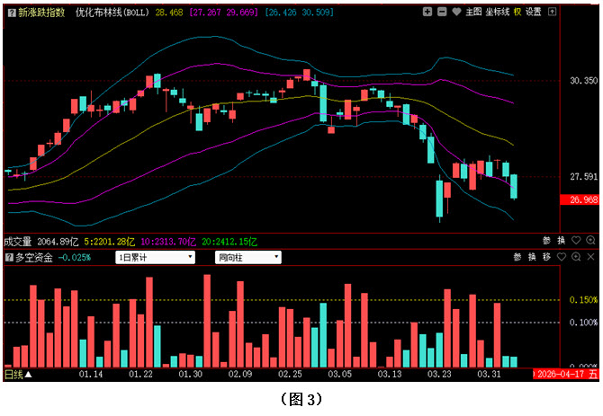 今日两市上涨个股共698只,其中涨幅超过3%的个股219只,涨幅在9.9%以上的个股51只;下跌个股共4461只,其中跌幅超过3%的个股1748只,跌幅在9.9%以上的个股38只。图3所示为指南针特有的0Z指数K线图,从图中可以看到,今日0Z指数延续昨日的下跌走势,继续向下回落,最终以阴线报收,收盘位置重新回到优化布林下紫线的下方。可见今日场内多数个股都出现了连续下跌,市场整体走势依然偏弱。从下方的多空资金来看,今天多空资金为流出状态,虽然资金流出量较小,但在弱势环境下,空方的连续打压往往会对投资者产生极大的心理压力,所以多方想要快速扭转局面,绝非易事。另外需要提醒大家特别注意的是,自3月25日开始,0Z指数就没有进一步向上反弹,而是进入横向震荡状态,但今日的阴线已将横向震荡区间的下沿位置跌破。在这种情况下,若清明假期后多方无法及时反击,行情将很可能出现继续下探,甚至不排除0Z指数有跌破3月23日低点的可能。