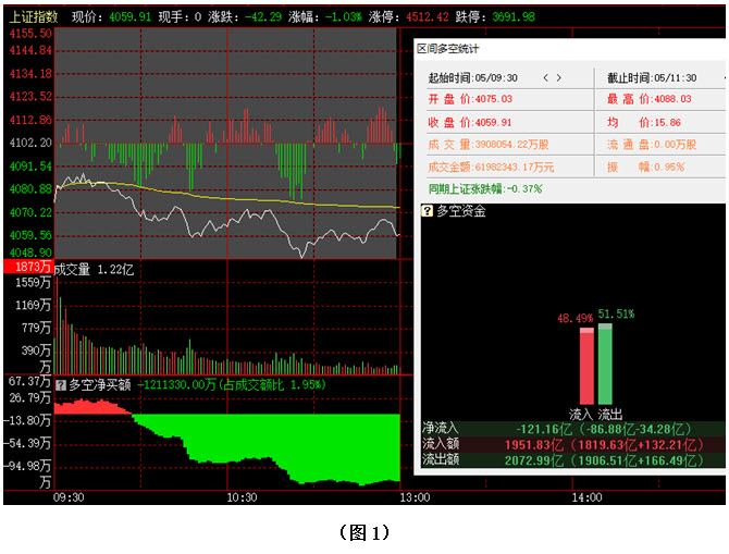 今日早间大盘直接低开在4080点下方,且无力向上反弹,市场重心逐步下移,至中午收盘时,指数位于4059点。从日K线图上看,今天上午大盘明显受到5日成本均线与13日成本均线的联合压制,指数无法向上形成突破,只得再次向下寻求支撑,可见市场短期走势依然偏弱,而5日成本均线与13日成本均线又有即将形成死叉的迹象,所以若多方后续无力,行情就很难快速破开上方压力,不排除后市会有再度考验4000点支撑的可能。从下方的多空资金来看,早间开盘后,多方率先占据优势,但资金进场力度较弱,于是随着大盘逐步下探,资金很快由红翻绿,并持续流出。截止到中午收盘时,沪市当中多方力量低于空方超过3个百分点,资金流出120多亿。从六大战区的情况分别来看,截止到今日中午收盘时,虽然深市小盘战区与沪市小盘战区均为资金流入状态,但两个战区的资金流入额均不足20亿;其余四个战区则均为资金流出,其中不仅深中大盘战区资金流出超过95亿,沪中大盘战区的资金流出额更是高达110亿。可见今日上午整体上资金以流出为主,且权重类板块与中小盘个股都面临着较强的抛压,空方力量明显强于多方。在这种情况下,多方很难发力大幅上攻,行情在4100点下方或仍有震荡反复的可能。建议大家在控制好仓位的同时,密切关注多空资金的进出变化以及34日成本均线对大盘的支撑情况,若空方连续施压,34日成本均线轻易失守,那么市场很可能会继续下行,再度考验4000点支撑。