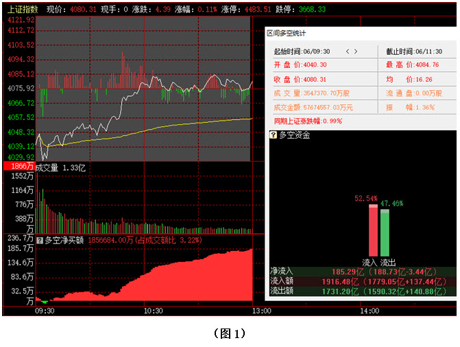 今日早间大盘低开30多点,好在市场只是略作下探就在4030点附近获得支撑,随后快速回升到4080点附近,但4080点上方压力依然较大,多方暂时还无法向上形成有效突破,至中午收盘时,指数位于4080点。从日K线图上看,今天上午大盘低开后在34日成本均线附近获得支撑,但向上依然明显受到5日成本均线与13日成本均线的联合压制,所以目前指数正运行在一个狭小的夹缝当中,市场即将面临方向性选择。从下方的多空资金来看,早间开盘后,多方就占据优势,虽然盘中空方也曾试图施压,但资金只是略微翻绿就再度翻红,之后随着大盘向上回升,资金进场的力度更是持续加大。截止到中午收盘时,沪市当中多方力量高于空方超过5个百分点,资金流入180多亿。从六大战区的情况分别来看,截止到今日中午收盘时,六个战区均为资金流入状态,且创业板战区、沪中大盘战区、以及深中大盘战区的资金流入额均超过了110亿。可见今日上午多方全面发力,各战区均有资金积极进场加仓。在这种情况下,行情自然无法连续下探,但若要市场重新转强,并进一步向上攀升,多方的后续力量还需不断跟上。建议大家在控制好仓位的同时,密切关注多空资金的进出变化以及指数在4030点至4080点之间的运行情况,在该区间尚未被打破之前,市场将继续反复震荡。
