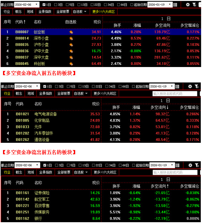 从板块资金动向数据来看,截止到今日收盘时,在资金流入榜上,电气电源设备板块以98.32亿的资金流入额位居榜首;其次是化学制品板块,资金流入64.57亿;此外,元件板块、汽车零部件板块、通信设备板块也都相继上榜,三个板块的资金流入额分别为53.01亿、41.13亿、40.54亿;再看资金流出榜,证券保险板块引领做空,资金流出21.65亿;其次是航空军工板块,资金流出13.79亿;此外,百货零售板块、传媒服务板块、银行板块的资金流出额也都相对较多,分列资金流出榜第三到第五名位置。综合比较后可知,今日不仅电气电源设备板块资金流入高达98亿,化学制品、元件、汽车零部件、通信设备等板块的资金流入额也都在40亿之上,在它们的带动下,场内多方人气快速回升,全天资金流入超过10亿的板块多达22个;反观空方阵营,虽然证券保险板块资金流出超过20亿,同时航空军工、百货零售、传媒服务、银行等板块的资金流出额也都在10亿之上,但与多方力量相比,整体抛压并不是很大。从六大战区的情况分别来看,截止到今日收盘时,六个战区均为资金流入状态,其中不仅创业板战区与沪中大盘战区资金流入双双超过135亿,深中大盘战区的资金流入额更是高达201亿。可见今日多方全面发力反击,各战区均有资金大幅进场加仓。在这种情况下,行情自然无法连续下探,但若要市场重新转强,并进一步向上攀升,多方的后续力量还需不断跟上。建议大家在控制好仓位的同时,密切关注多空资金的进出变化以及指数在4030点至4080点之间的运行情况,在该区间尚未被打破之前,操作上切勿盲目追涨杀跌,而是应以多看少动为主。