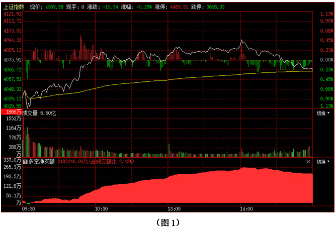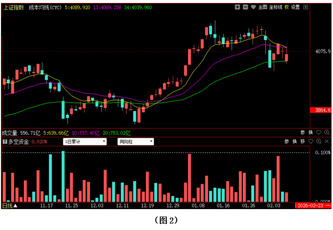 如图1所示,今日早间大盘虽低开30多点,但指数只是略作下探就在4030点附近获得支撑,随后市场快速回升至昨日收盘点位附近,并频频向4080点上方发起冲击,午后大盘跃过4080点,且在盘中一度摸至4095点,可惜尾盘时市场连续回落,导致指数依然未能向上形成有效突破,最终以4065点收盘。从下方的多空资金来看,早间开盘后,多方就占据优势,虽然盘中空方也曾试图施压,但资金只是略微翻绿就再度翻红,之后随着大盘向上回升,资金进场的力度更是持续加大。可见今日资金进场较为坚决,多方力量明显强于空方,说明目前投资者进场参与做多的热情依然普遍较高。在这种情况下,行情就难以出现连续大幅杀跌,但由于春节长假临近,多方此时大幅拉升的可能性也相对较小,所以接下来市场很可能会继续保持在4000点上方,反复震荡整理。建议大家控制好仓位,同时关注近期有资金连续流入的板块,并在其中优选个股,逢低吸纳。