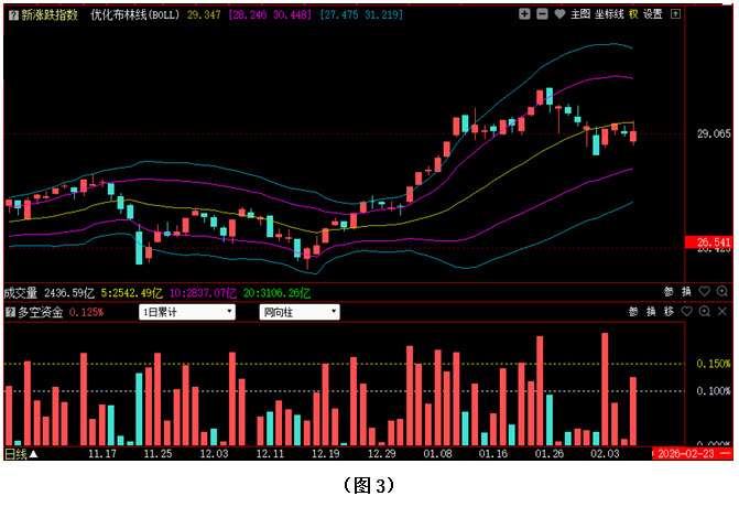 今日两市上涨个股共2574只,其中涨幅超过3%的个股419只,涨幅在9.9%以上的个股72只;下跌个股共2444只,其中跌幅超过3%的个股260只,跌幅在9.9%以上的个股6只。图3所示为指南针特有的0Z指数K线图,从图中可以看到,今日0Z指数向上反弹时明显受到优化布林中轨压制,由于无法向上形成有效突破,所以只得再度回落整理,最终收盘位置比昨日只是略有上移。可见今日场内多数个股既没有大幅上涨,也没有大幅下挫,市场整体走势依然偏弱。从下方的多空资金来看,今日多空资金为流入状态,且资金流入量较昨日大幅增加,说明又有资金试图进场抄底。但0Z指数并没有回升至优化布林中轨上方,且优化布林中轨有逐渐拐头向下的迹象。在这种情况下,如果接下来0Z指数仍无法站上优化布林中轨,就可能会在优化布林中轨的反压之下出现继续下探。建议大家控制好仓位,保持谨慎。